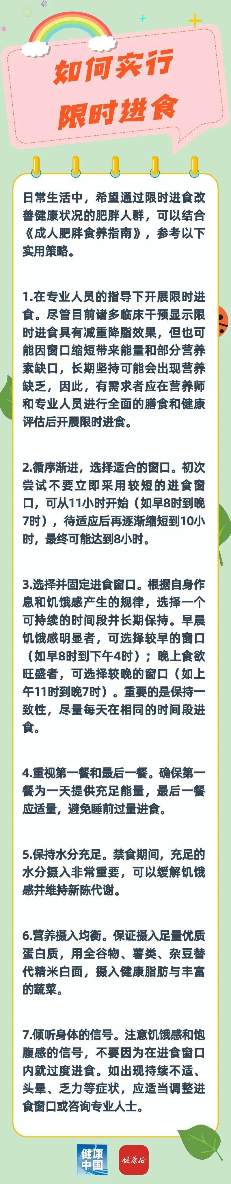 对于孕妇和哺乳期妇女、处于生长发育期的儿童青少年、有进食障碍史人群、糖尿病患者(特别是使用胰岛素或降糖药物者)、体重过轻或营养不良者、有特殊医疗要求的人群,限时进食则可能带来健康风险。因此,大家要在营养师或专业人员指导下开展限时进食,避免自行采取限时进食策略。