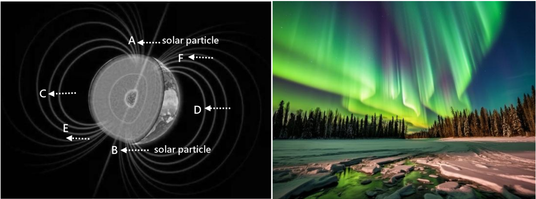 太阳风暴异常粒子与地磁场线的瞬时分布图中,A、B、C、D 四点为 90 度夹角的正交碰撞位置,E、F 点为 0 度和 180 度夹角的碰撞位置。A、B 点反对称位于地磁轴线南北极两侧,正交碰撞能量密度最大,极光最显著;C、D 点因离子数量少或处于白天(背后夜间),能量密度较低;E、F 点碰撞角偏离 90 度,亮度较弱。