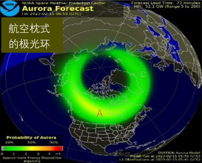 地球极地轨道卫星或地球同步轨道卫星从太空俯瞰时,地球球体形态使高纬度环形极光投影为椭圆。A 点与 F 点空间上相对地磁轴对称,但 A 点能量密度高于F点,导致卫星观测到极地上空光环亮度不均,很像一个套在脖子上的航空枕。