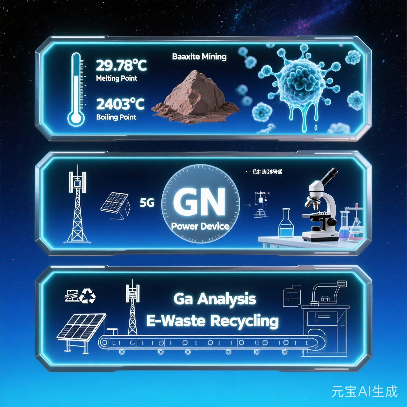 镓(Ga)具有高导电性、中等导热性和液态低毒等特性,是生产砷化镓、氮化镓、磷化镓及铜铟镓硒的必要原料。这些材料广泛应用于半导体、半导体发光元件、集成电路、晶体管、射频器件、低熔点金属GIS(镓铟锡)、功能合成材料以及CIGS(铜铟镓硒)薄膜太阳能电池等领域。其中,氮化镓还是最具代表性的第三代半导体材料之一,在高速电子器件和高效能电子系统中占据重要地位。砷化镓则广泛应用于光纤通信、军事雷达、电子战系统等领域。