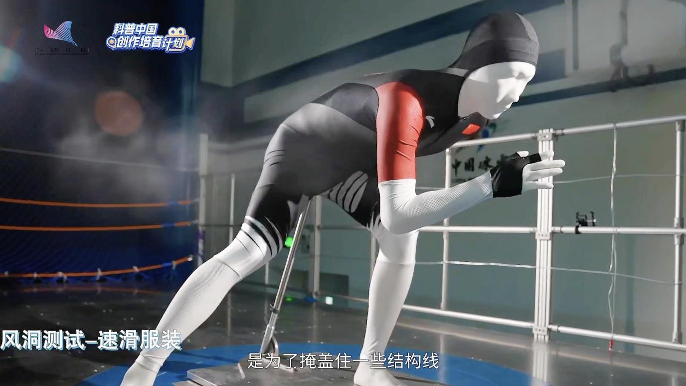 我们在制作他们的比赛服结构的时候,特别是对有些项目,不是按照正常的直立的姿态去做的,而是一种弓身的状态。那么运动员穿上它的时候,是保持在一种弯腰状态下,向前滑行的一个状态,这个时候其实是最利于他的姿态稳定,同时又加上最良好的减阻设计。为什么不让他直身站起来呢?因为它以一弓身弯下的时候,部分垂的面料就形成了阻力,所以我们在运动过程中,按照他运动的姿态做他的3D版型,我们把这件紧身服叫做站不起来的紧身连身服,非常形象,他是运动员在弓身,向前奔跑状态下的一个身体状态。