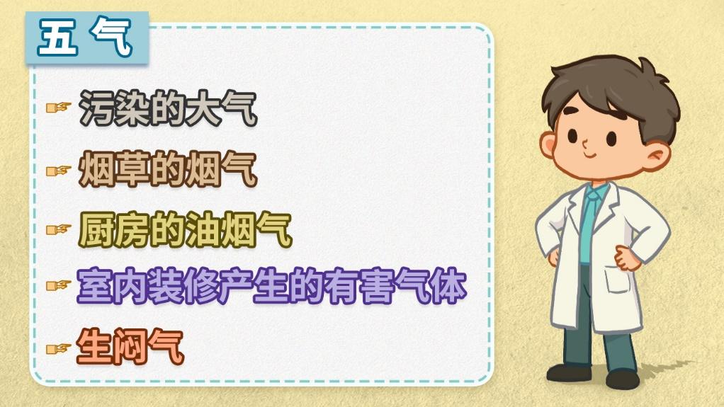 我们将肺癌的危险因素概括为“三霾”或“五气”。三霾指大气雾霾、烟霾、心里的阴霾。五气指污染的大气、烟草的烟气、厨房的油烟气、室内装修产生的有害气体、生闷气。