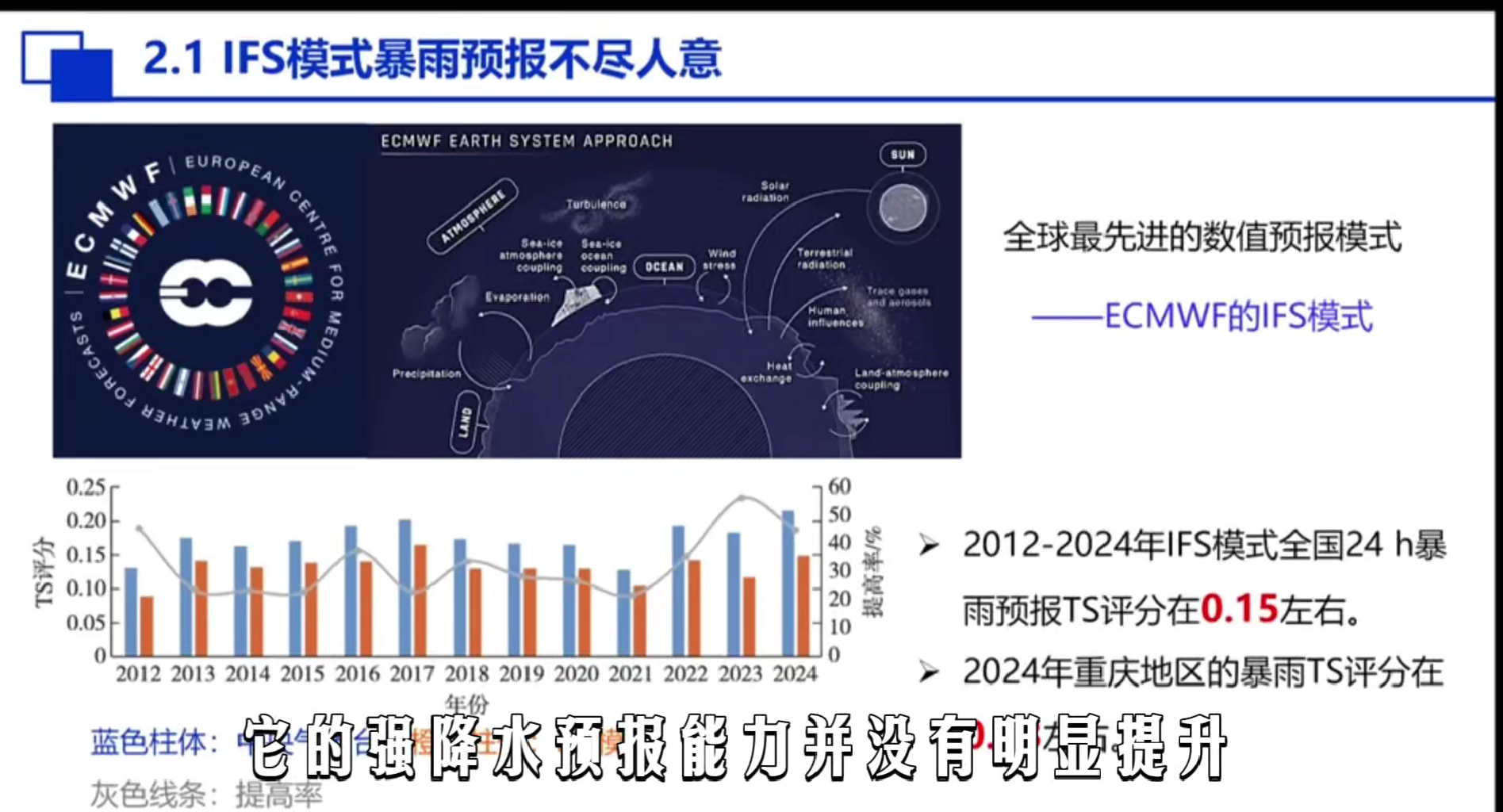 数难破局—强降水预报遇到“瓶颈”。近10余年,作为全球最先进的数值模式——欧洲中期天气预报中心的IFS模式,它的强降水预报能力并没有明显提升,24 h全国暴雨TS评分在0.15左右;2024年重庆地区的暴雨TS评分只有0.13,不尽人意。近些年气象部门建立了无缝隙智能网格预报体系,推动了气象预报从传统站点预报和落区定性预报,转变为精细定量的网格化预报,主客观融合后,暴雨预报质量有所提升,24 h全国暴雨TS评分提升至0.2左右,但面对极端降水的突发性和局地性,这还远远不够。强降水预报进入瓶颈期。