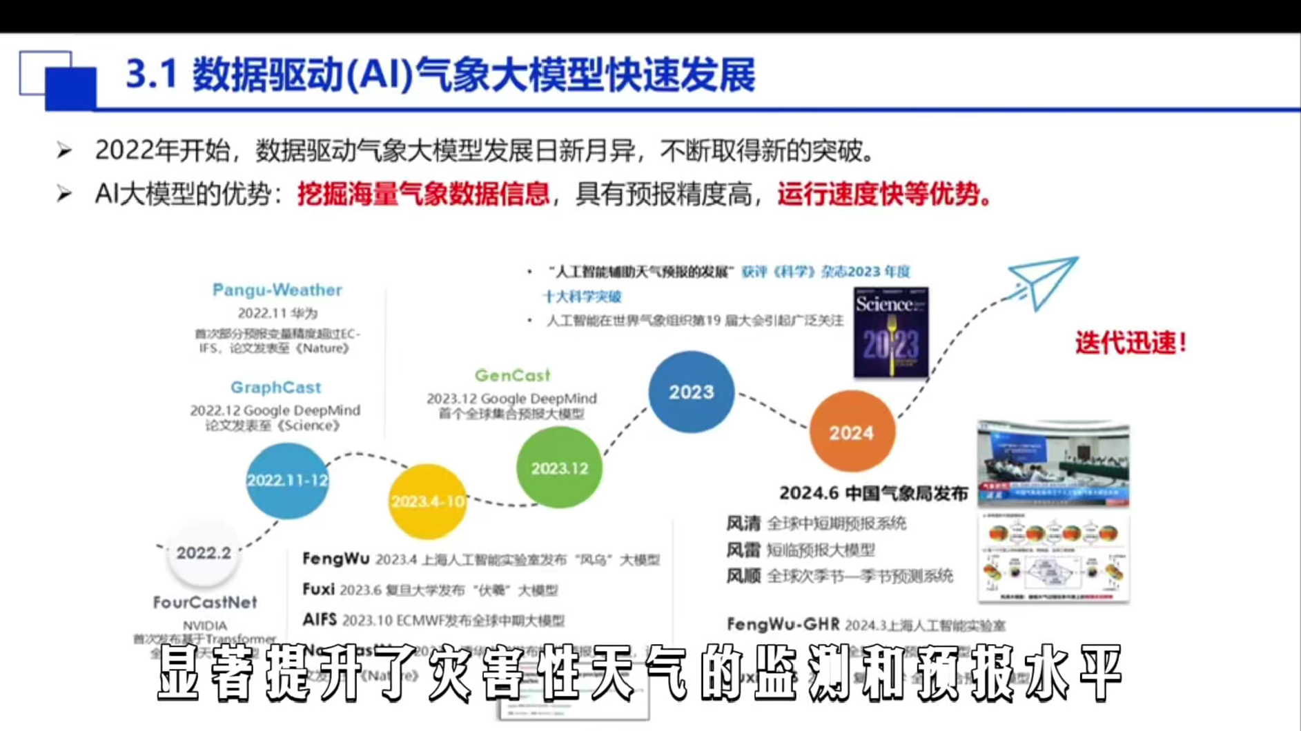 近年来,人工智能技术的浪潮席卷全球,气象预报也站上了AI风口。尤其是深度学习技术的应用,显著提升了灾害性天气的监测和预报水平。2022年,英伟达推出了全球首个天气预报大模型—FourCastNet;2023年,华为发布了“盘古”全球气象预报大模型,首次在统计意义上超过了IFS模式的大气环流预报,被评为该年度“中国科学十大进展”之一。从此,气象领域开启了“百模大战”。GraphCast、风乌、伏羲、AIFS、NowCastNet、GenCast、风雷、风清、风顺等大模型相继登场,从分钟级临近预报到季节尺度预测,AI百模大战争锋斗艳,气象预报跨进智能时代。