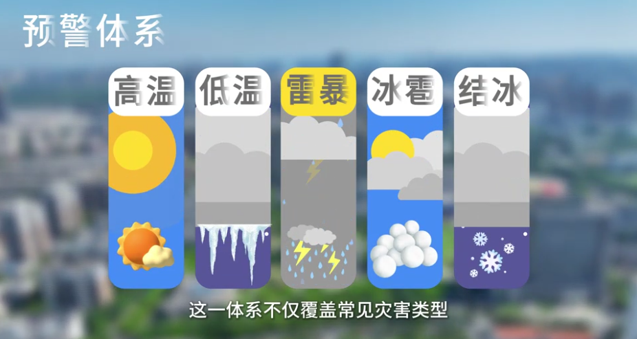 气象预警是应对灾害天气的第一道防线,目前我国已构建了一个包含14种(台风、暴雨、暴雪、寒潮、大风、高温、低温、雷暴、冰雹、道路结冰、雾、霾、干旱、沙尘暴)主要气象灾害的预警体系。这一体系不仅覆盖常见灾害类型,还特别强化了对强对流天气的监测和预警能力,确保公众能及时获取最新的预警信息,采取相应防范措施。