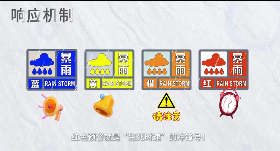 蓝色预警是“提醒哨”,黄色预警拉响“准备铃”,橙色预警下达“行动令”,红色预警就是“生死时速”的冲锋号!读懂这四种颜色,就掌握了防灾避险的关键密码。同时,公众需根据预警对应的防御要求及政府相关部门指示,及时做好防范和应对。