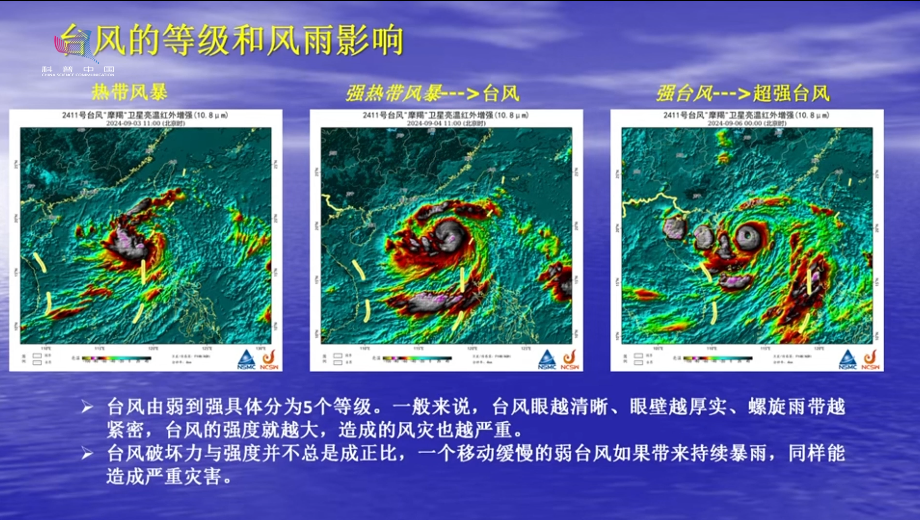 台风等级(顺带总体风雨影响):卫星对台风结构的观测是研判台风强度的最重要依据。台风由弱到强具体分为6个等级:热带低压、热带风暴、强热带风暴、台风、强台风和超强台风。一般来说,台风眼越清晰、眼壁越厚实、螺旋雨带越紧密,台风的强度就越大,造成的风灾也越严重。值得注意的是,台风破坏力与强度并不总是成正比,一个移动缓慢的弱台风如果带来持续暴雨,同样能造成严重灾害。