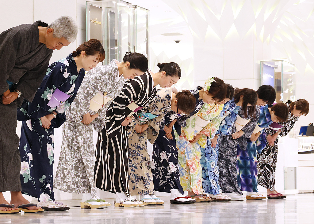 日本传统见面礼节是鞠躬。90度鞠躬,是礼节性最尊敬的方式,表示特别感谢或者道歉;45度鞠躬,多见于初次见面,鞠躬后多需交换名片;30度鞠躬,一般用于熟悉人打招呼,如早上遇到同事等。见面互相鞠躬以二三秒钟为宜;如果遇见好友,弯腰的时间要稍微长些;在遇到长辈的时候要等长辈抬头以后才可抬头,有时甚至要鞠躬很多次 。
