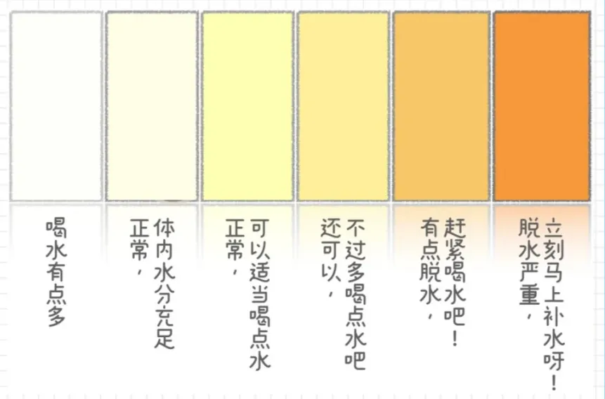 尿液颜色能够非常直观地反映个体饮水的状况:当饮水不足尿液呈深黄色,当饮水过多尿液呈清亮色,当饮水适当尿液呈清澈的淡黄色。