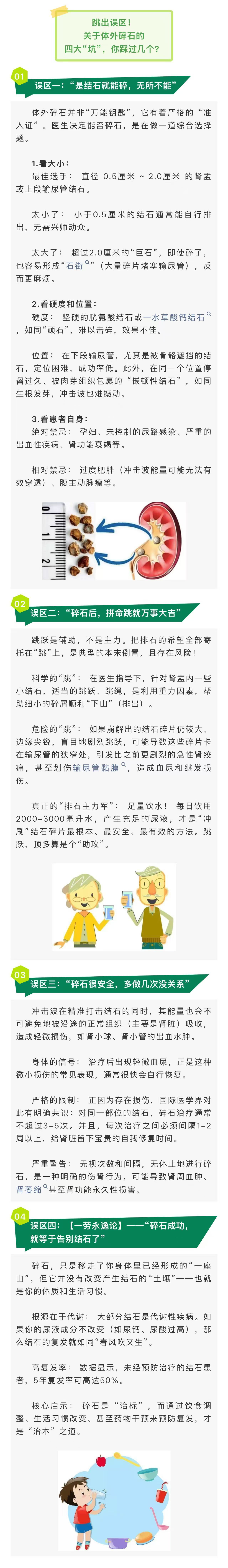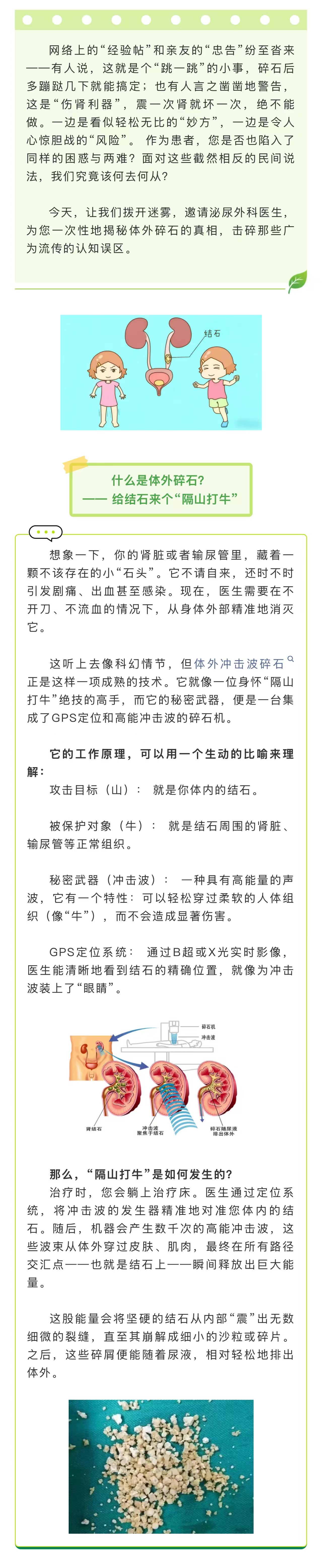 图文简介: 有人说,这就是个“跳一跳”的小事,碎石后多蹦跶几下就能搞定;也有人言之凿凿地警告,这是“伤肾利器”,震一次肾就坏一次,绝不能做。泌尿外科医生为您一次性地揭秘体外碎石的真相,击碎那些广为流传的认知误区。