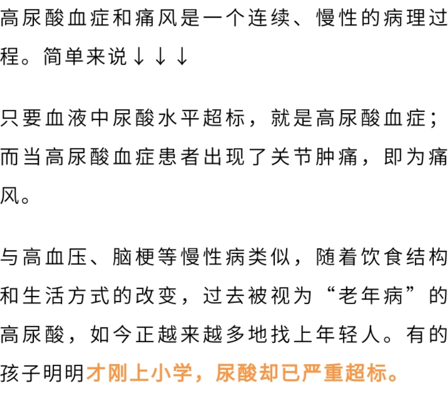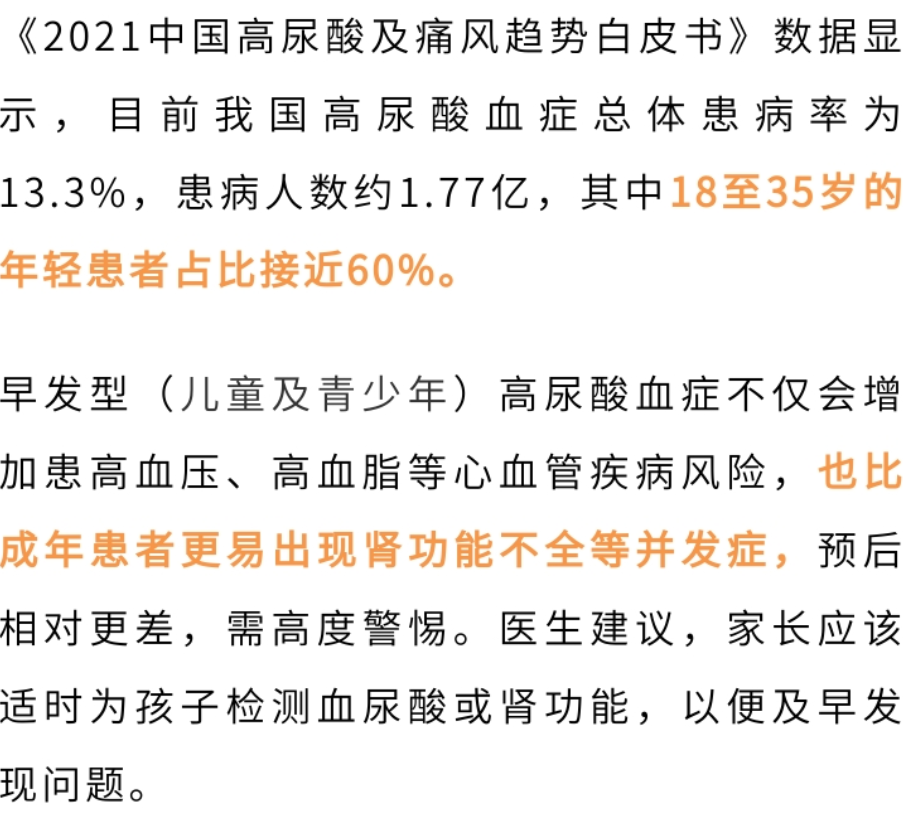 杭州一名12岁男孩正在读四年级,身高1米48,体重126斤,肚子特别大。检查结果显示,其尿酸数值高达440微摩尔/升(同龄孩子尿酸正常值应≤357微摩尔/升),被确诊为高尿酸血症。