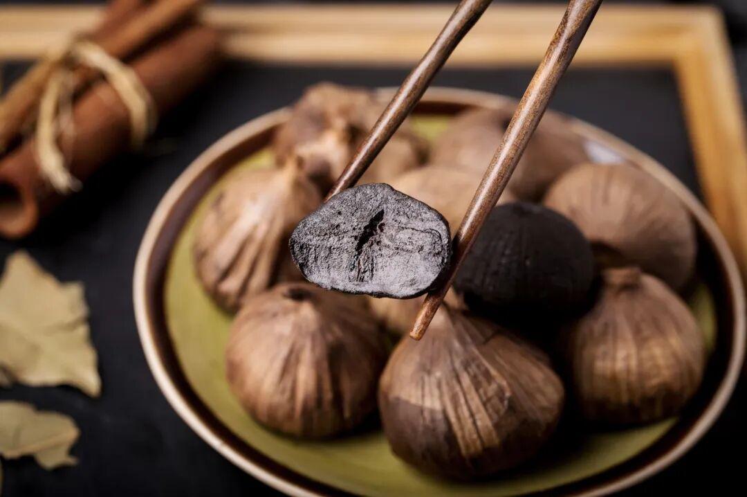 它的制作过程非常简单:将新鲜大蒜在高温(通常在 60°C 至 90°C)和高湿度(70%至 90%)的条件下,持续熟化数周到数月[1]。整个过程不添加任何化学物质,完全依赖大蒜自身的成分进行美拉德反应。正是这种反应,让大蒜的颜色由白变黑,口感由辛辣刺激变得酸甜软糯,彻底失去了大蒜特有的刺激性气味。