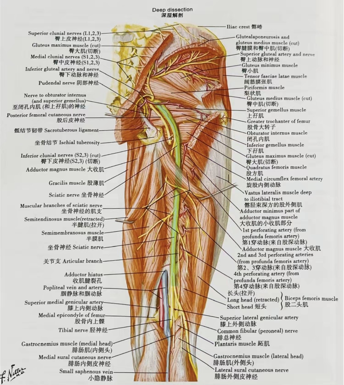 坐骨神经(sciatic nerve)起源于L4~S3脊神经,是骶丛的主要分支之一,亦是人体最长最粗大的神经,直径可达1cm左右。坐骨神经由腰骶部发出后,经臀部延伸至大腿后部、小腿和脚部。坐骨神经是股后群肌、小腿和足肌的运动神经,也是小腿和足的重要感觉神经。