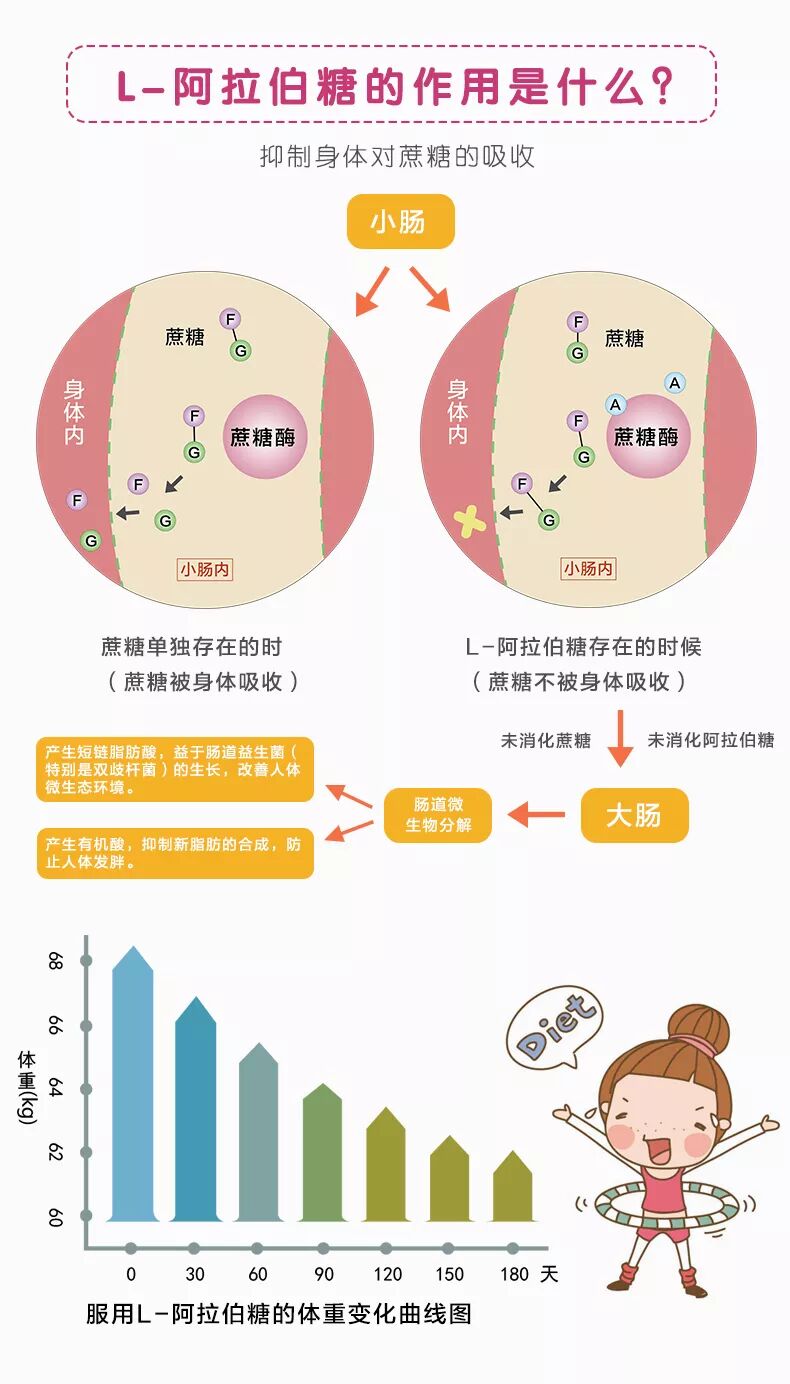 而L-阿拉伯糖和木糖醇一样都是:低热量的糖。但是不同的是:而L-阿拉伯糖的口感是蔗糖甜度的50%左右。吃了之后,并不会像吃了木糖醇一样食欲大增。并且L-阿拉伯糖还具有调节肠胃蠕动,减少内脏脂肪、 延缓餐后中性脂肪吸收的速度。所以L-阿拉伯糖 越来越受年轻女士的钟爱,在日本,美国,欧洲等地大受追捧。
