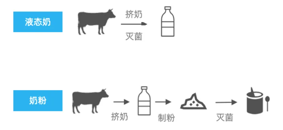 液态奶和奶粉都是以牛奶为原料进行不同工艺的加工: