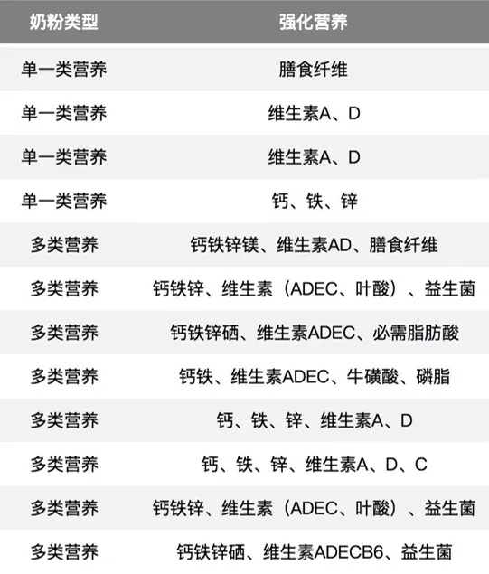 ● 调制奶粉:添加糖、乳化剂等,也有的会根据不同人群添加钙、铁、维生素D、益生菌等强化营养素。