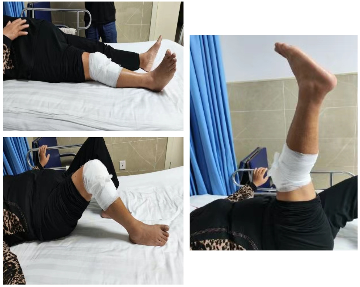 (▲患者术后患肢伸直、屈膝、抬腿状态)