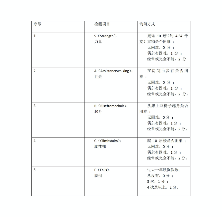 (1)SARC-F问卷:作为国际通用的肌少症筛查工具,总分>4分者可诊断为肌少症。