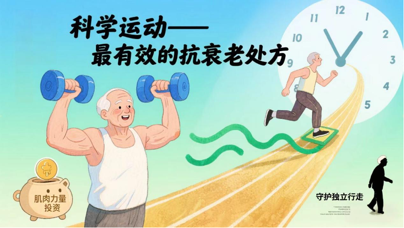 预防和对抗肌少症是一场与时间的赛跑,而科学运动是最核心、最有效的“抗衰老处方”。从今天开始,每一次抗阻训练都是对肌肉力量的投资,每一次平衡练习都是对独立行走的守护。肌肉不会因年龄增长而拒绝生长,它只对科学的刺激作出回应。让每一位中国老人都能拥有支撑尊严的肌肉力量,享受自主、活力的银龄人生——这不仅关乎个体健康,更是实现健康老龄化社会的基石。