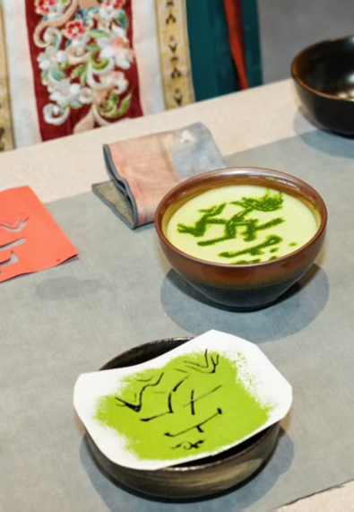 更极致的是,他们利用泡沫呈现出具有诗意的山水、花鸟图案,这就是“茶百戏”——类似现代的咖啡拉花,却早了近千年。