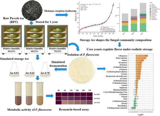 Methods: RPT samples were stored under defined Aw conditions, during which microbial communities were characterized using Internal Transcribed Spacer (ITS) sequencing, and flavor metabolites were analyzed through gas chromatography-mass spectrometry (GC–MS), liquid chromatography-mass spectrometry (LC-MS). Correlation analyses and core strain-inoculated fermentations under simulated and realistic Aw conditions were conducted to investigate the relationship between microbial dynamics and flavor evolution.