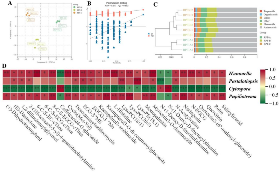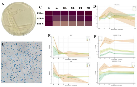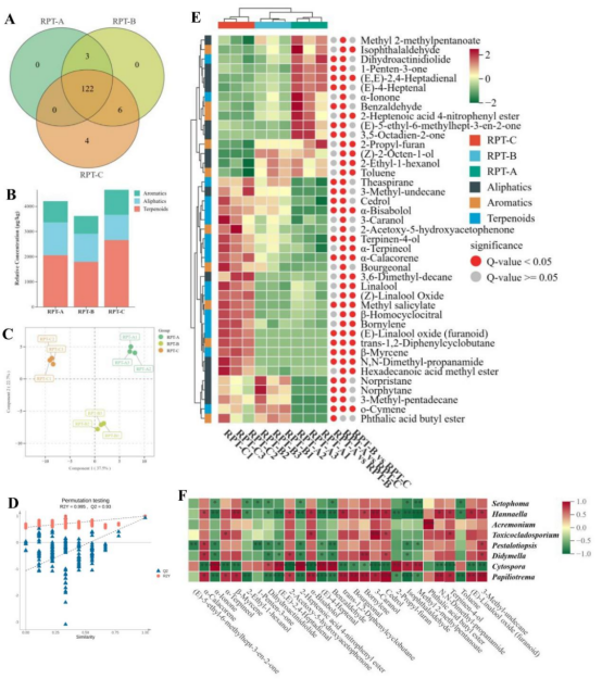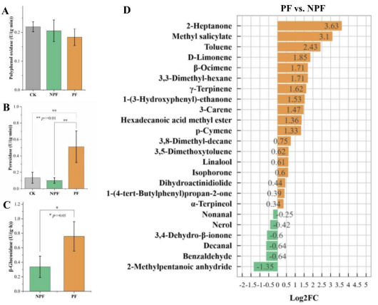 图5. 真实仓储条件下,浅黄隐球酵母(Papiliotrema flavescens RPT)的产酶特性及其对茶叶代谢产物的调节作用。 (A) 对比未接种(NPF),P. flavescens多酚氧化酶(PPO)活性。(B) 对比NPF,P. flavescens过氧化物酶(POD)活性。(C) 对比NPF,P. flavescens β-葡萄糖苷酶(β-GC)活性。(D) P. flavescens RPT和NPF之间差异挥发性代谢产物以log2倍变化;正值表示接种组上调,负值表示下调。