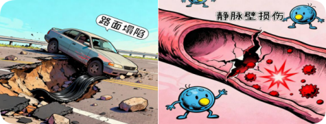 1.“路面塌陷”(血管损伤) 久坐使腿部血管长时间受压变形,高血糖、吸烟等因素也会加速血管内壁损伤,形成“破洞”。