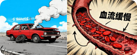 3.“车辆抛锚”(血流淤滞) 静坐不动时,血液流速可降至正常的十分之一,如同堵在高峰期的车流。