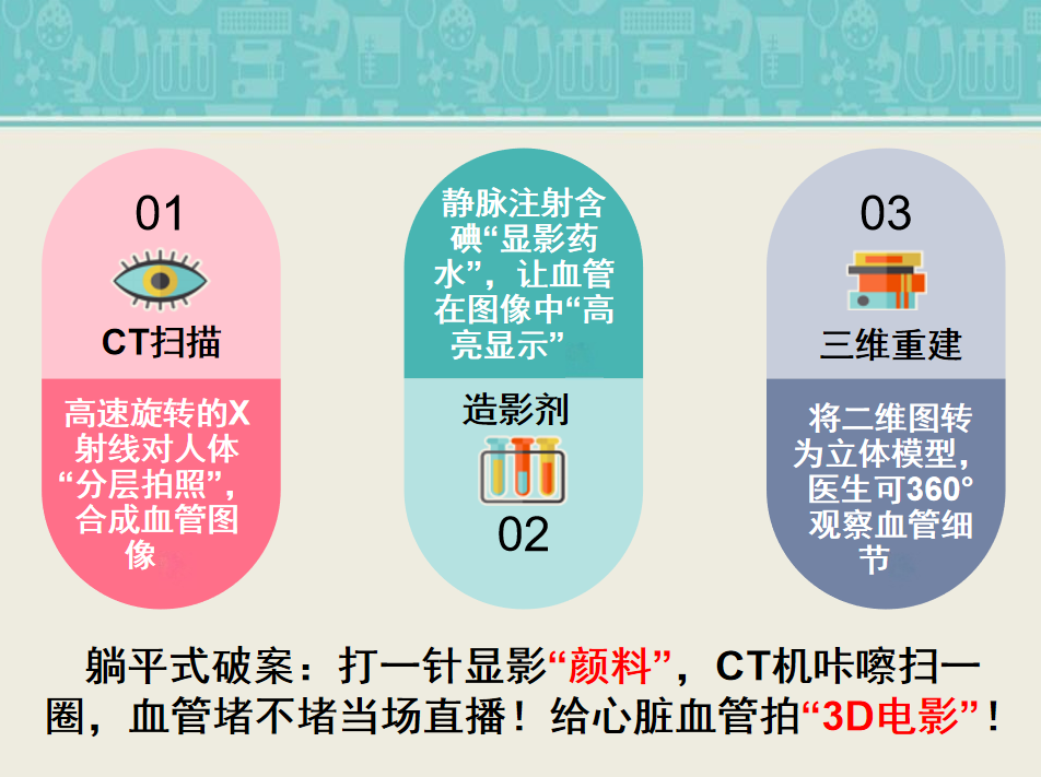 冠脉CTA可以理解为一次心脏血管的“高清直播”,它能清晰显示血管内部情况,连直径0.5毫米的斑块都无处遁形。