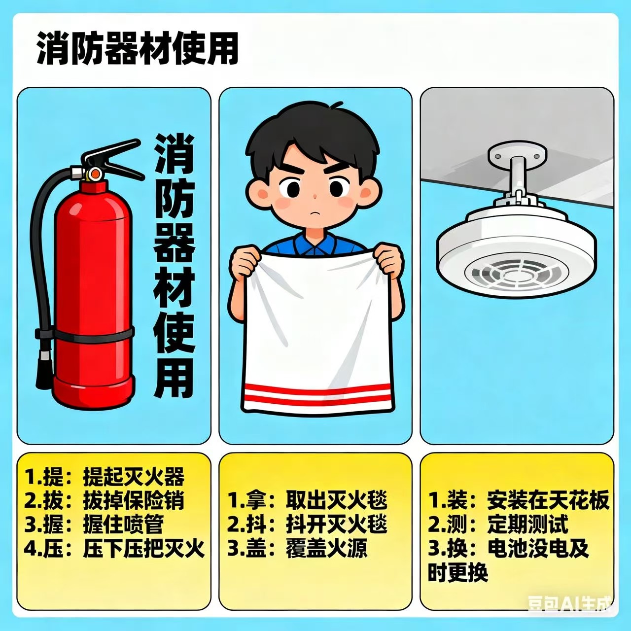 居家常备消防物:每户配备灭火器、灭火毯、烟雾报警器,厨房、卧室等关键区域按需放置,定期检查有效性,熟练掌握使用方法。