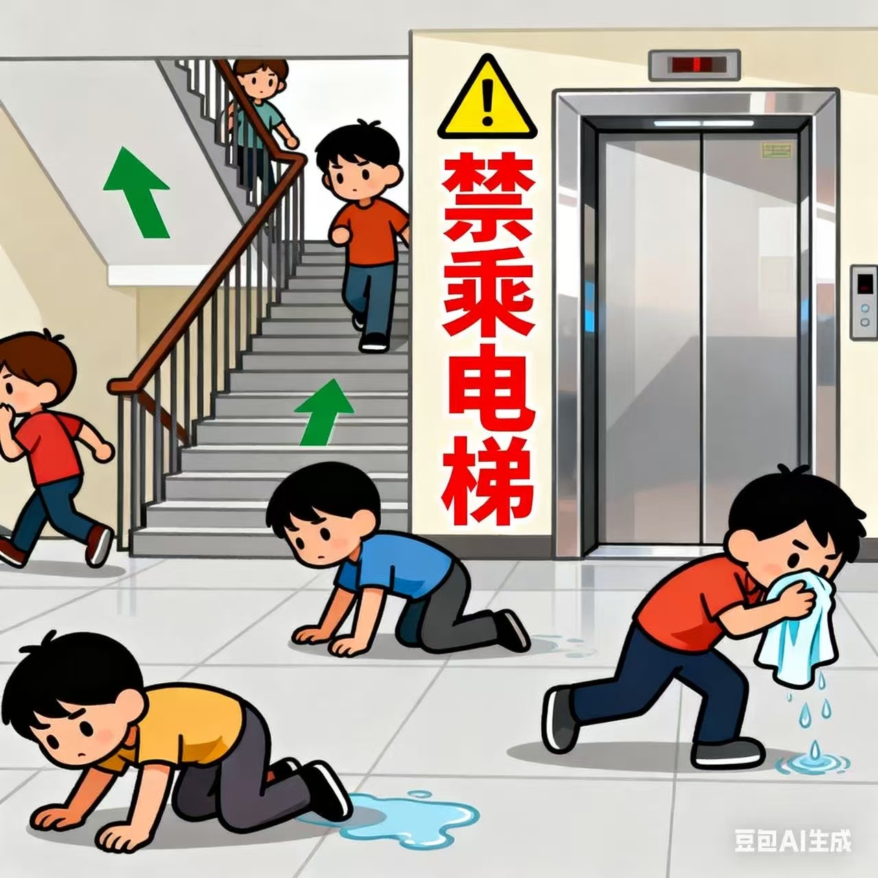 防烟呛咳是重点:火灾中多数伤亡源于浓烟中毒,逃生时用湿毛巾、衣物捂住口鼻,弯腰低姿前行(浓烟向上漂浮,低处烟雾较少),避免吸入有毒气体;