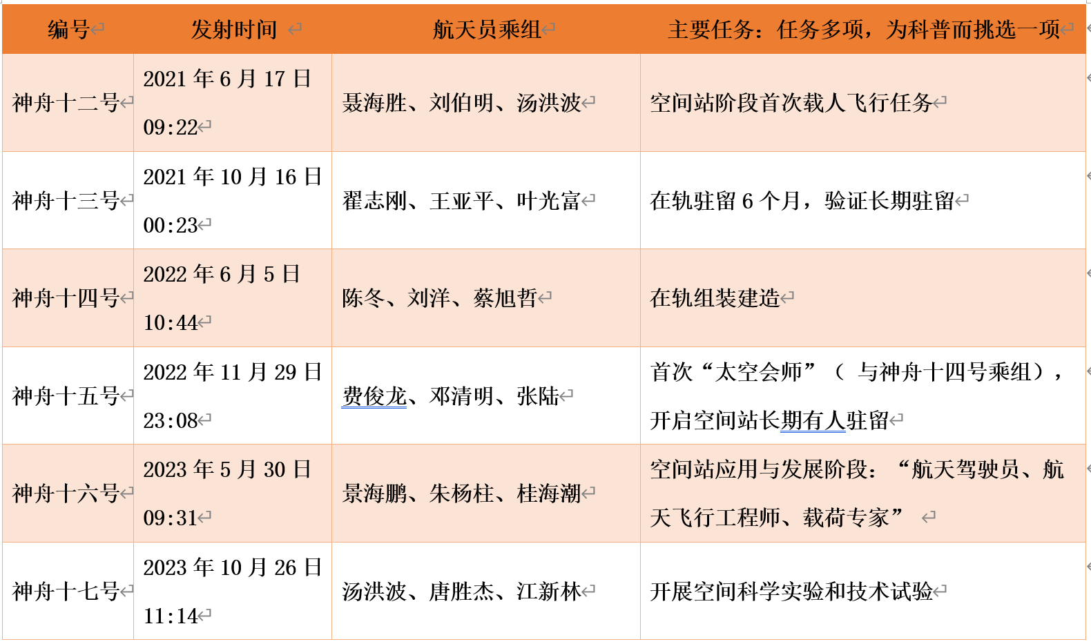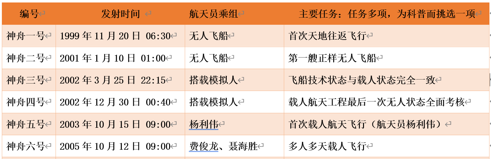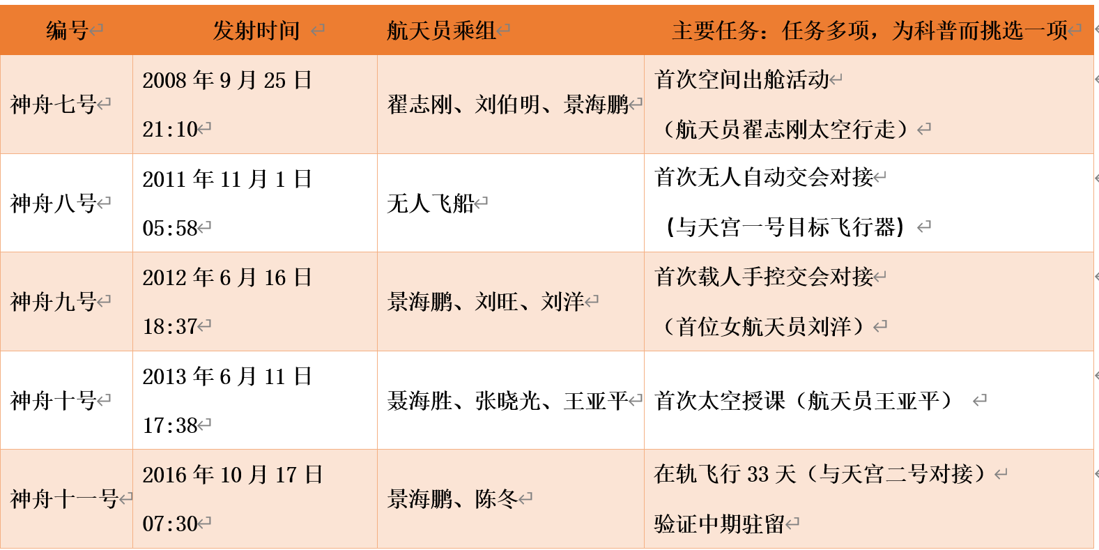 神舟编号从神舟一号到神舟二十二号,时间跨度从1999年到2025年,空间科学包括:空间科学研究与应用、航天技术试验、航天医学实验和航天育种搭载实验,实现了我国载人航天工程的每个首次。
