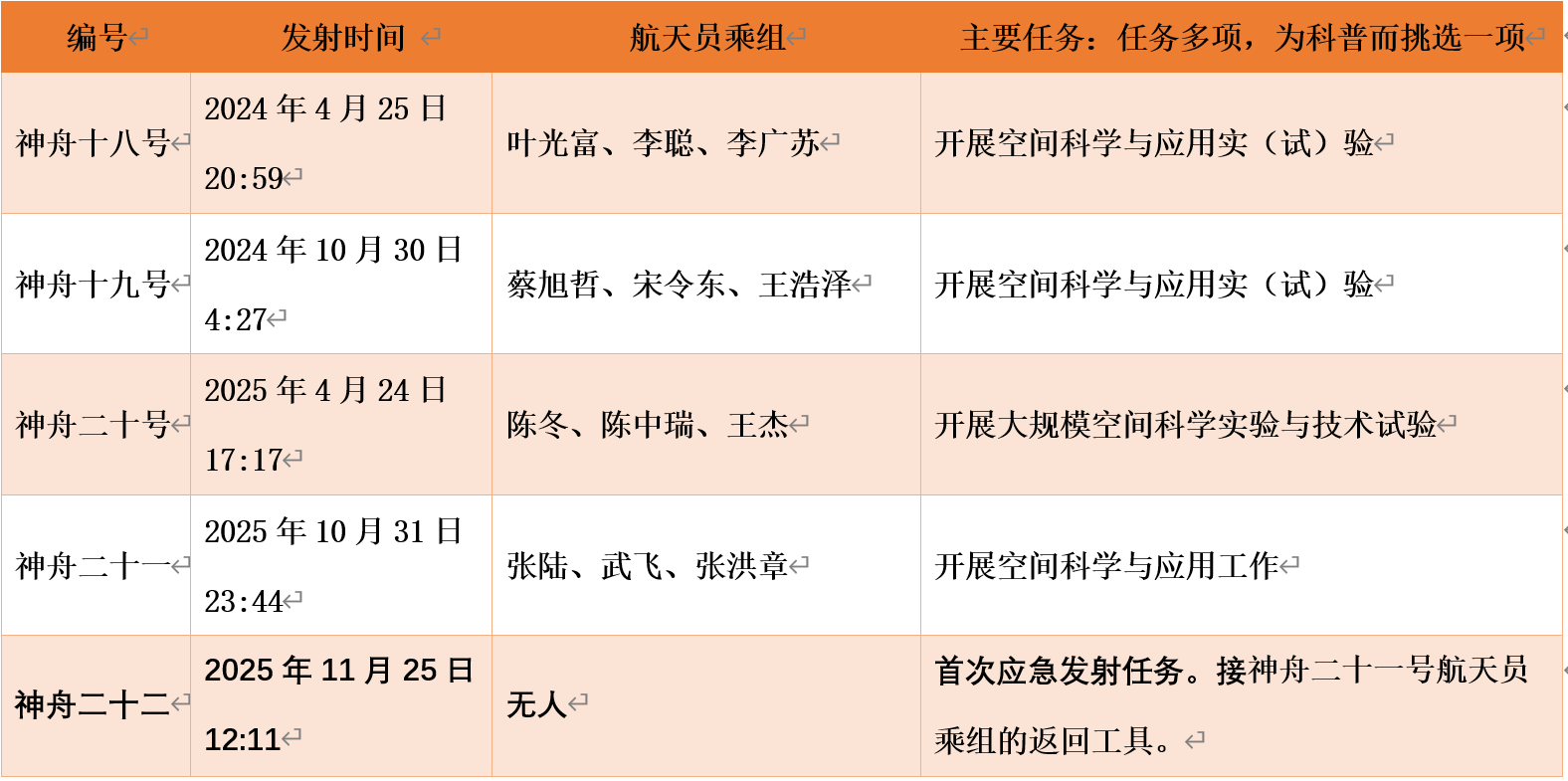 2025年11月25日的神舟二十二号属于应急发射任务,去时不载人可进行大规模物资补给,回时接神舟二十一号航天员乘组。