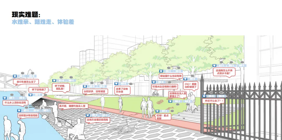 滨水空间缺少规划,护栏阻隔、台阶破损,居民无法安全亲水。沿岸杂草丛生、裸土外露,缺少骑行道和慢行系统。桥下阴暗逼仄、空间利用率低,驿站空空如也。想要坐下歇息,甚至都没有一张合适的座椅。水边活动几乎没有,只有零散垂钓,存在安全隐患。