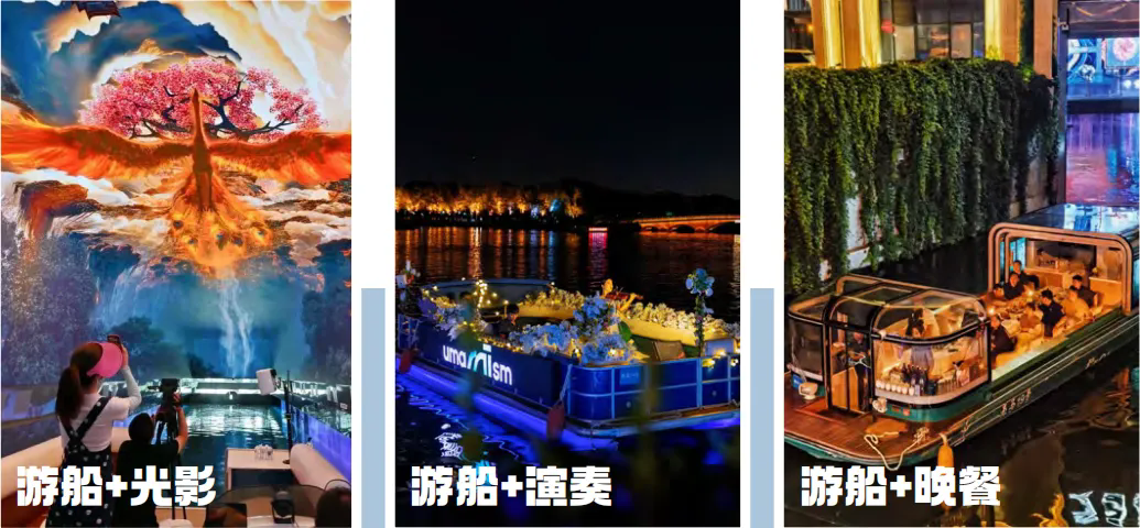 亮马河创新推出光影艺术游线,开发多种类型游船体验活动,包括浪漫夜景游船、美食船上派对以及摄影主题游船等,并引入声光感应浮标实现游船与岸线灯光秀实时互动。让游客能够拥有多样化的选择,在享受旅程时体验水陆空立体沉浸场景的娱乐活力的同时,体验到丰富的娱乐活力,带动夜间客流与消费潜力。