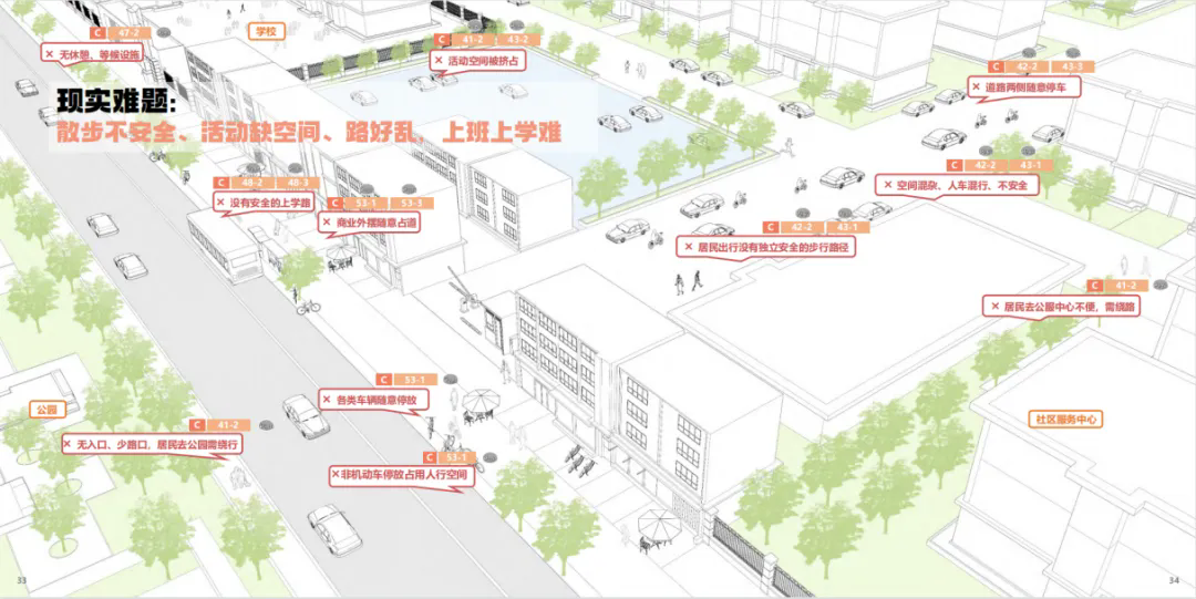 在不少社区里,公共空间杂乱无序:人车混行,孩子上学要穿越马路;社区道路坑洼狭窄,缺少绿化和活动设施;老人想散步、孩子想玩耍,都找不到安全的地方。夜间照明不足,居民出行提心吊胆,甚至连最基本的休憩座椅也没有。出门不是去健身休闲,而是“提心吊胆”地走一遭。