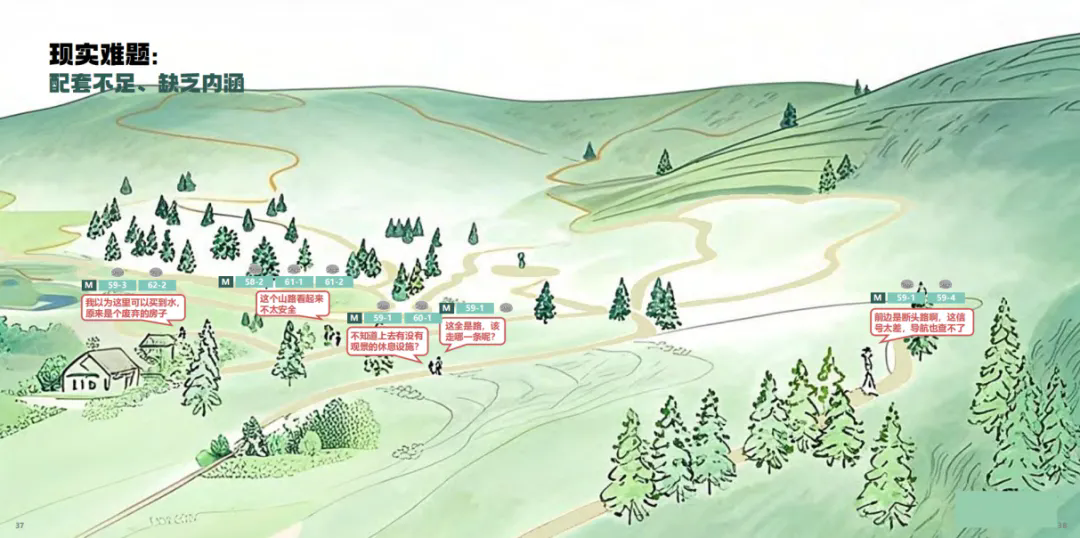 山林里道路年久失修,坑洼不平、泥泞湿滑,游客出行不便;沿途缺少标识指引,独自出行容易迷路。基础设施不足,既没有休憩驿站,也缺乏补给点。村落与绿道之间衔接不畅,游客很难融入当地生活。人少、路荒、安全感不足,让山水美景成了“远观不可近用”的存在。