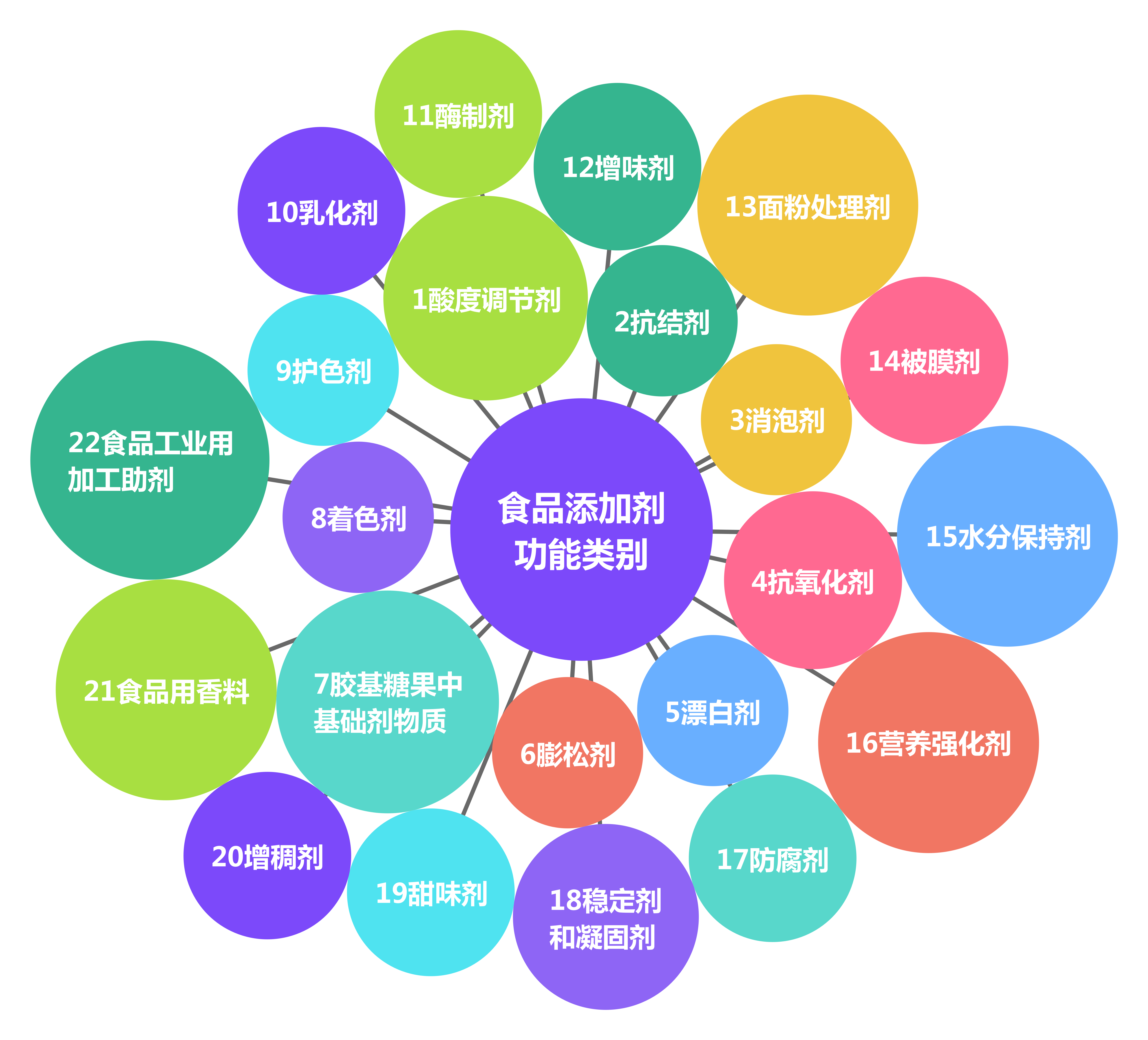 那么,现代意义上的食品添加剂究竟是什么呢?根据我国《食品安全国家标准 食品添加剂使用标准》(GB 2760-2024)规定,食品添加剂是指为改善食品品质和色、香、味,以及为防腐、保鲜和加工工艺的需要而加入食品中的人工合成或者天然物质。目前,我国批准使用的食品添加剂有2300多种,按功能可分为22个类别,常见的有抗氧化剂、膨松剂、着色剂、防腐剂、甜味剂、食品用香料等。
