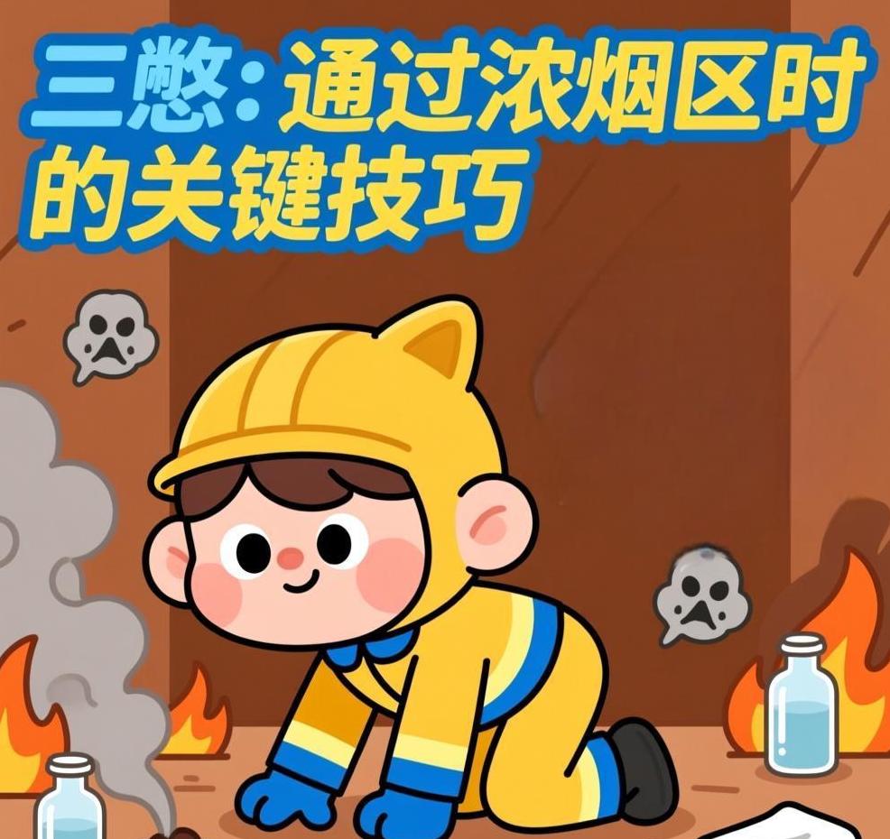 三憋:通过浓烟区时的关键技巧。在必须穿越浓烟区域时,尽量保持低姿态前进,因为有毒气体和浓烟往往聚集在空气的上层,务必要掌握短暂屏息的技巧,可利用空瓶保存氧气,在屏气至无法忍受时短暂换气。对准瓶口吸一口气,迅速盖紧瓶盖,避免毒烟侵入。如果身边没有瓶子可用,可以用衣物或毛巾遮住口鼻,减少吸入有害物质的风险。屏息的时间因人而异,但通常不宜超过十秒,以免造成缺氧。