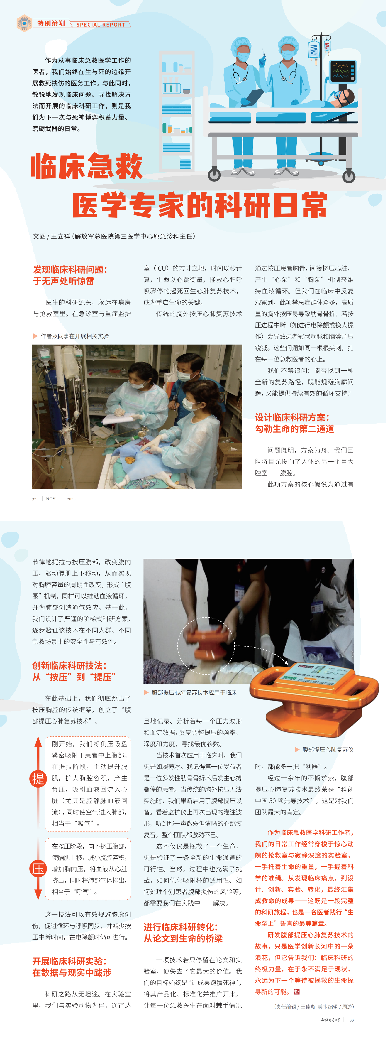 作为一名从事临床急救医学的医者,始终在生死时速的边缘上进行“救死扶伤”的医务工作。与此同时,敏锐的发现临床问题、寻找到解决方法而开展的临床科研,则是我们为下一次与死神博弈积蓄力量、磨砺武器的“日常”。在急诊室与ICU的方寸之地,时间以秒计算,生命以心跳衡量,拯救心脏呼吸骤停的起死回生心肺复苏术,就成为重启生命的主角。传统胸外按压心肺复苏(CPR)是挽救心搏骤停患者的基石,数十年来拯救了无数生命。然而,作为一名长期奋战在一线的临床医生,我深知这项经典技术的局限:对于存在胸廓畸形、肋骨骨折、或正在接受开胸手术的患者,那赖以生存的“胸外按压”却可能无从下手,甚至带来二次伤害。正是这份临床实践中的“无力感”,成为了我们科研征程的起点。