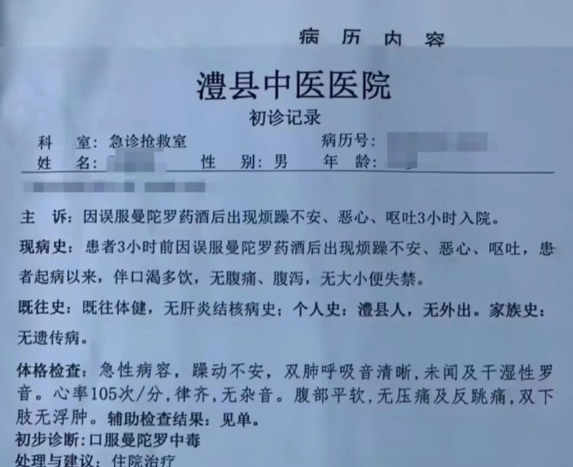 一个原本普通的聚会夜,却因一杯“偏方药酒”突然变了味,近日,澧县中医医院接诊了一名52岁的男性患者,他在友人家中不慎饮下约二两毛曼陀罗泡制的药酒,短短数分钟内便出现神志恍惚、语无伦次、躁动不安、呕吐不止等症状,现场立即陷入混乱。