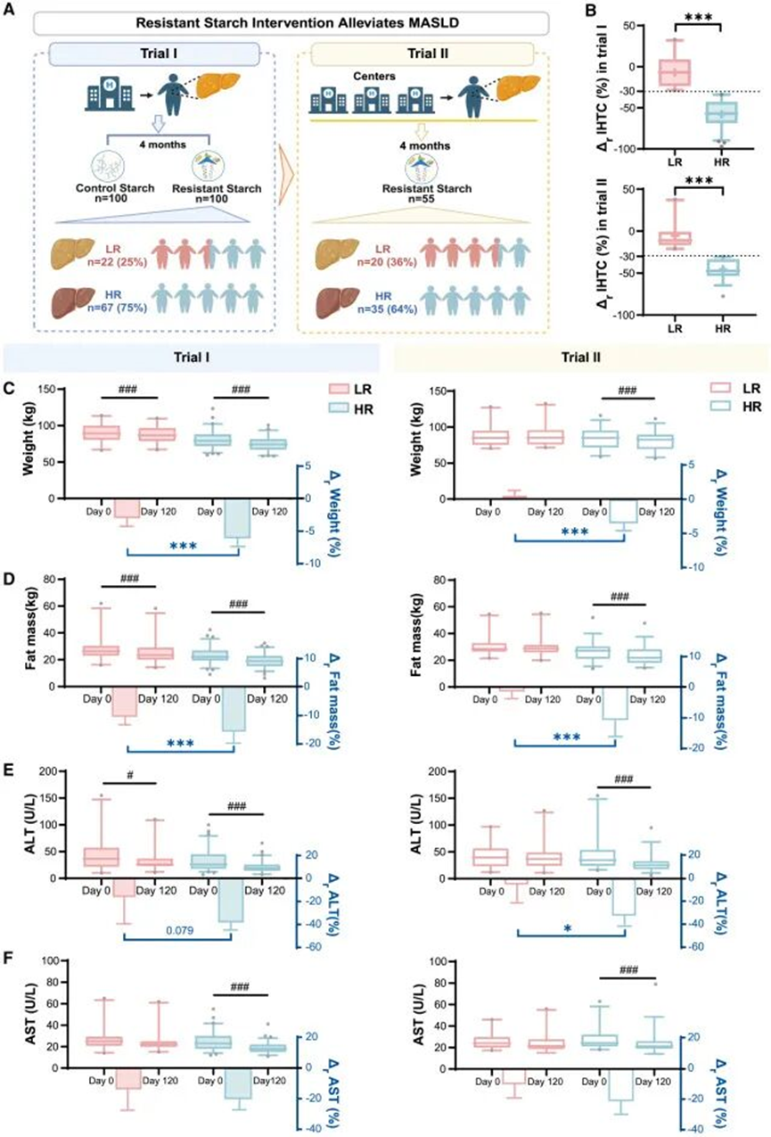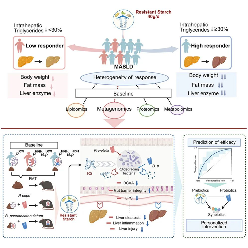 尽管2023年的研究证明了抗性淀粉整体效果显著,但在临床实践中,仍有30%的参与者肝脏脂肪减少幅度不足10%。于是,科研团队在2025年的研究中探究了这个核心问题:为什么有的人效果显著,有的人却收效甚微?借助多组学分析和粪便微生物群移植实验,研究团队发现,基线时的肠道微生物群构成,是决定抗性淀粉治疗效果的核心要素。