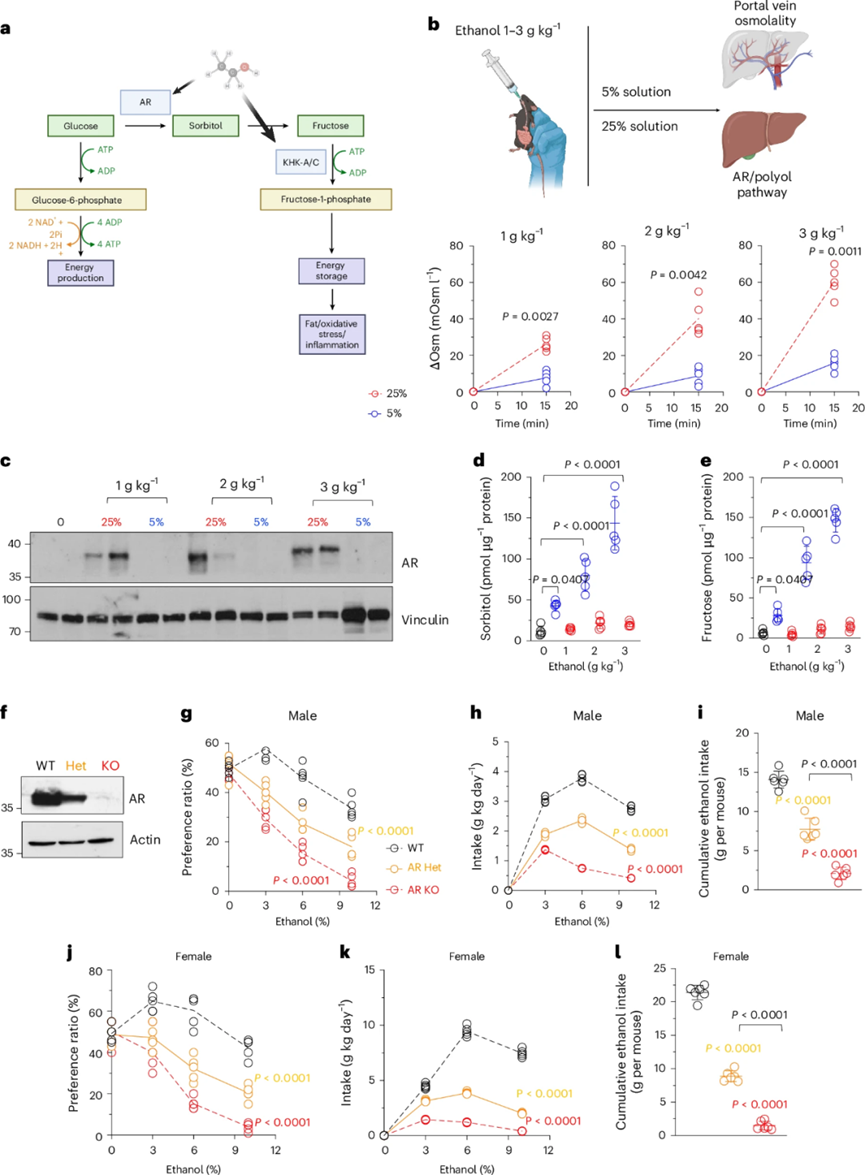 科罗拉多大学安舒茨医学院的研究人员观察到,长期摄入酒精的小鼠,其肝脏中KHK的表达会显著上调。而KHK是果糖在体内进行代谢的最初、也是最关键的一个步骤的催化酶。这引发了科学家的思考:酒精和果糖这两种看似不同的物质,在代谢上是否存在某种交集?为了验证这一点,研究人员进行了一系列实验。他们首先构建了全身性KHK敲除(KHK-KO)的小鼠模型,结果令人震惊:当失去KHK后,小鼠对酒精的偏好急剧下降。在二选一实验中(一瓶是水,一瓶是掺有酒精的水),正常小鼠会随着时间推移,逐渐偏好饮用酒精;而KHK-KO小鼠则截然不同,它们自始至终都对酒精兴趣不大,其酒精摄入量远低于对照组。这种偏好改变并非因为尝不出酒精味。研究人员通过短期的味觉测试证实,KHK-KO小鼠能够正常辨别酒精溶液。这表明,KHK的缺失直接影响了大脑对酒精“奖赏”效应的感知,从而减少了主动饮酒的动机。