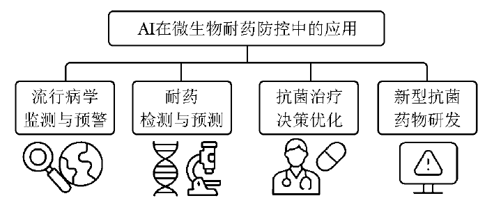 在此背景下,人工智能(AI)技术的快速发展为AMR防控提供了新的解决方案。其中机器学习(ML)和深度学习(DL)具备强大的数据挖掘与模式识别能力,能够有效整合基因组信息、电子病历与流行病学数据,可应用于耐药性预测、病原体识别、个体化治疗推荐、新药研发及抗菌药物管理等多个关键环节[9-13]。AI的引入不仅提升了数据处理效率,也为实现更快速、精准的感染防控提供了可能。本文将系统阐述AI技术在微生物耐药防控中的临床应用(图1),重点探讨其在流行病学监测、耐药性检测、临床决策以及新药研发等领域的应用价值,旨在为相关领域的基础研究及临床实践提供理论依据。