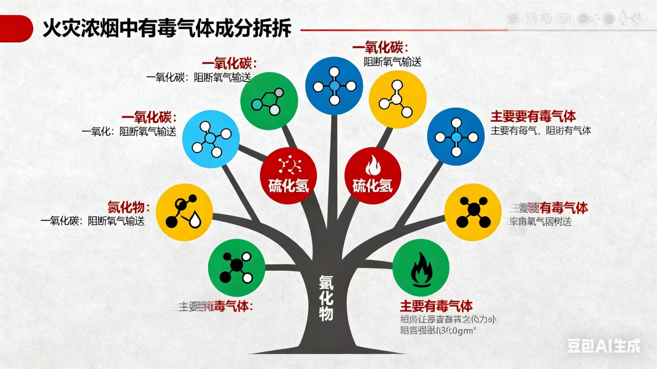 更危险的是,浓烟中含有多种剧毒气体,且无色无味难以察觉。木材、塑料、化纤、家具等常见可燃物燃烧时,会产生一氧化碳、硫化氢、氰化物等有毒物质。其中一氧化碳毒性极强,它与人体血红蛋白的结合能力是氧气的 200-300 倍,一旦吸入,会快速阻断氧气输送,即便浓度仅为 0.1%,吸入半小时也可能致命;而化纤、塑料燃烧产生的氰化物,更是剧毒物质,少量吸入便会导致呼吸、心跳骤停。