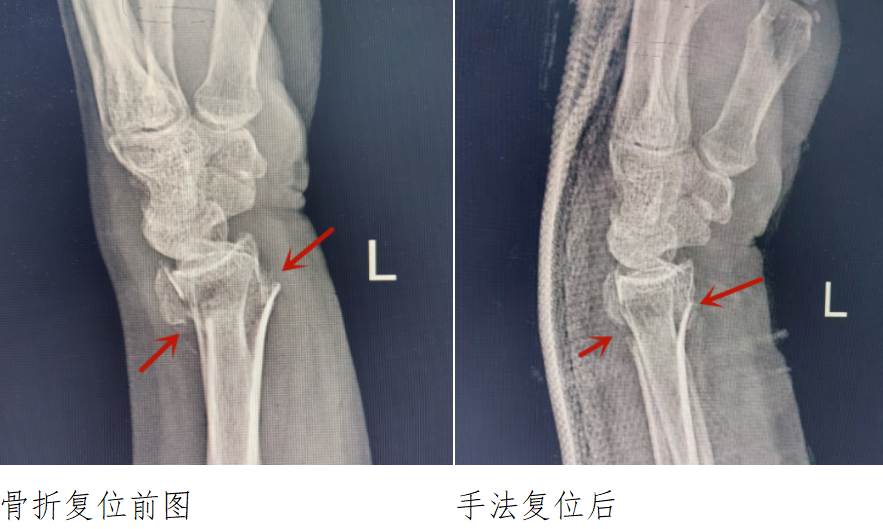 熊伟主治医师接诊后,通过询问病史及体查,考虑手腕骨折,遂立即给患者安排手腕照片检查,结果显示桡骨远端骨折,伴明显移位。通过局部麻醉,精准手法复位及石膏外固定后,患者疼痛得到缓解,骨折复位效果满意。