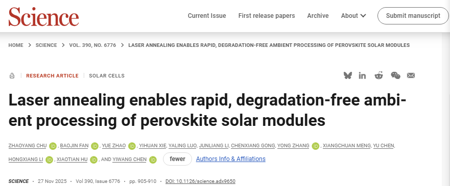 当全球都在为碳中和目标争分夺秒,光伏产业的每一次突破都牵动着能源转型的脉搏。近日,中国科研团队发表在《科学》杂志的一项研究,给光伏赛道投下了一枚 “深水炸弹”:一束 455 纳米的激光,仅用 20 秒,就破解了钙钛矿太阳能电池困扰全球的量产难题 —— 常压环境下 100 平方厘米刚性组件效率达 24.0%,柔性组件 20.7%,稳定性更是翻倍提升。这不是实验室里的 “数字游戏”,而是中国光伏从 “跟跑” 到 “领跑” 的关键一跃,更是人类向清洁能源时代迈进的硬核底气。