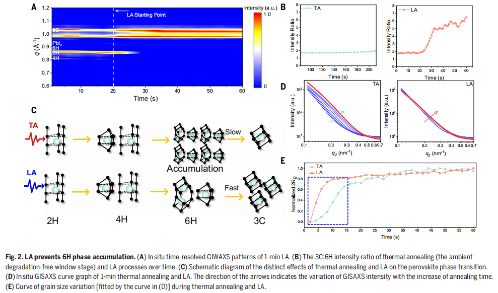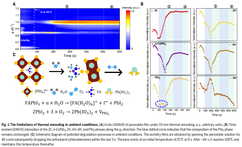 为了让钙钛矿晶体充分生长,热退火需要在惰性气体中 “慢炖” 数十分钟,可一旦暴露在空气中,水和氧气就成了致命杀手:123 秒,这是科研团队精准捕捉到的 “降解窗口期”,超过这个时间,水分子会侵入晶体引发结构坍塌,氧气会氧化材料导致性能暴跌;而延长加热时间,又会催生出有害的 6H 相,让电池效率进一步衰退。