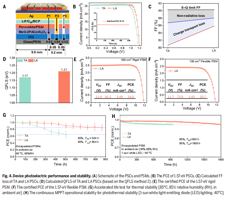 数据是最硬核的证明:小面积电池效率从 24.0% 飙升至 26.2%,85℃、85% 湿度的加速老化测试中,激光退火组件 864 小时仍保持 85% 初始效率,是传统组件的 1.7 倍;更关键的是,整个过程无需惰性气体保护,直接在常压空气中完成,砍掉了真空设备的巨额成本,让钙钛矿的 “低成本优势” 真正落地。