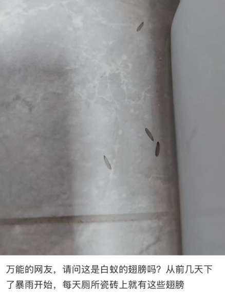 这些翅膀很可能是已经找好巢穴的白蚁脱落下来的。看到它们就有可能意味着白蚁已经在你家里安家了,但这时候它们应该还没有建立庞大的白蚁家族。如果你幸运地在翅膀周围找到了未来的蚁王和蚁后,把它们消灭掉,也是有机会把危害消灭在萌芽之中的。